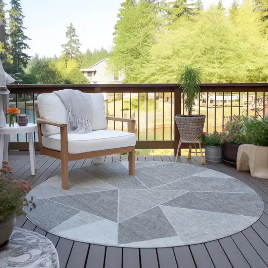 Add some artistry to your room with this 8-foot gray silver and graphite round geometric washable indoor outdoor area rug. This geometric round shaped rug features a geometric pattern in gray, silver, and graphite that combines a good looking print with a unique and updated shape. The mix of shape, color, and design gives this rug refreshing visual interest. Ideal for outdoor spaces or high traffic areas with kids and pets, this rug is made from heavy duty polyester that is stain resistant to help repel water, dirt, and stains. Makes a great way to dress up your patio, porch, or poolside, but also works well as a durable and easy to maintain option in the kitchen, family room, or mudroom. 96-inch h x 96-inch w x 0.19-inch d.