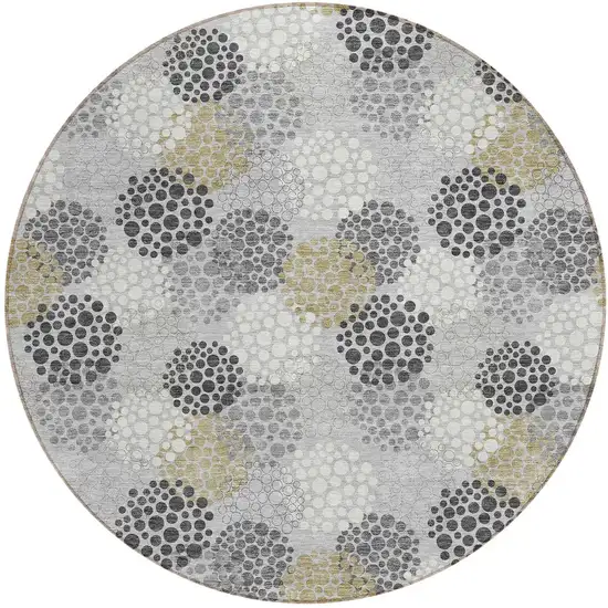 Set an inviting tone in your space with this 8-foot gray silver and ivory round polka dot washable indoor outdoor area rug. This geometric round shaped rug features a polka dot pattern in gray, silver, and ivory that combines a good looking print with a unique and updated shape. The mix of shape, color, and design gives this rug refreshing visual interest. Ideal for outdoor spaces or high traffic areas with kids and pets, this rug is made from heavy duty polyester that is stain resistant to help repel water, dirt, and stains. Versatile in use, durable, and easy to maintain, this rug is an ideal solution to add a decorative and inviting touch to your indoor or outdoor space. 96-inch h x 96-inch w x 0.19-inch d.