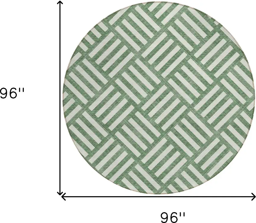 Add great coloration and comfortable texture to your space with this 8-foot green and ivory round geometric washable indoor outdoor area rug. This geometric round shaped rug features a geometric pattern in green and ivory that combines a good looking print with a unique and updated shape. The mix of shape, color, and design gives this rug refreshing visual interest. Ideal for outdoor spaces or high traffic areas with kids and pets, this rug is made from heavy duty polyester that is stain resistant to help repel water, dirt, and stains. Makes a great way to dress up your patio, porch, or poolside, but also works well as a durable and easy to maintain option in the kitchen, family room, or mudroom. 96-inch h x 96-inch w x 0.19-inch d.