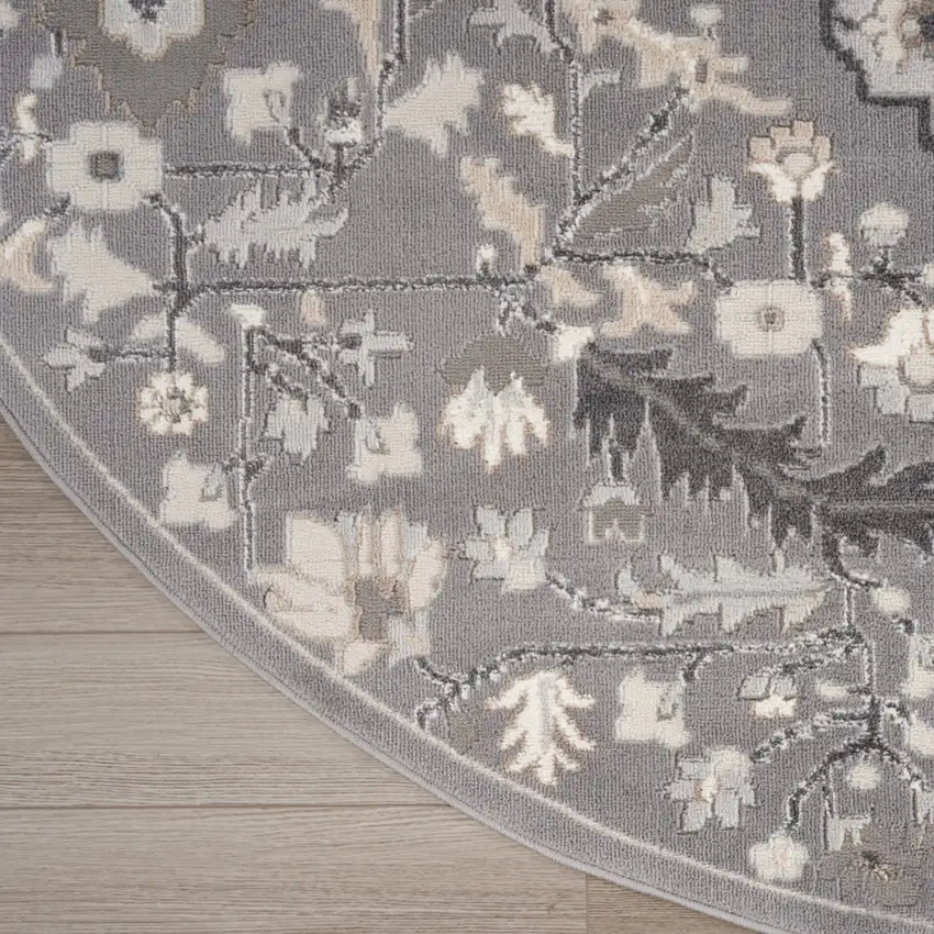 8' Ivory Black and Gray Floral Medallion Non Skid Round Rug