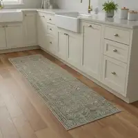 8' Ivory Blue And Brown Oriental Runner Rug With Fringe