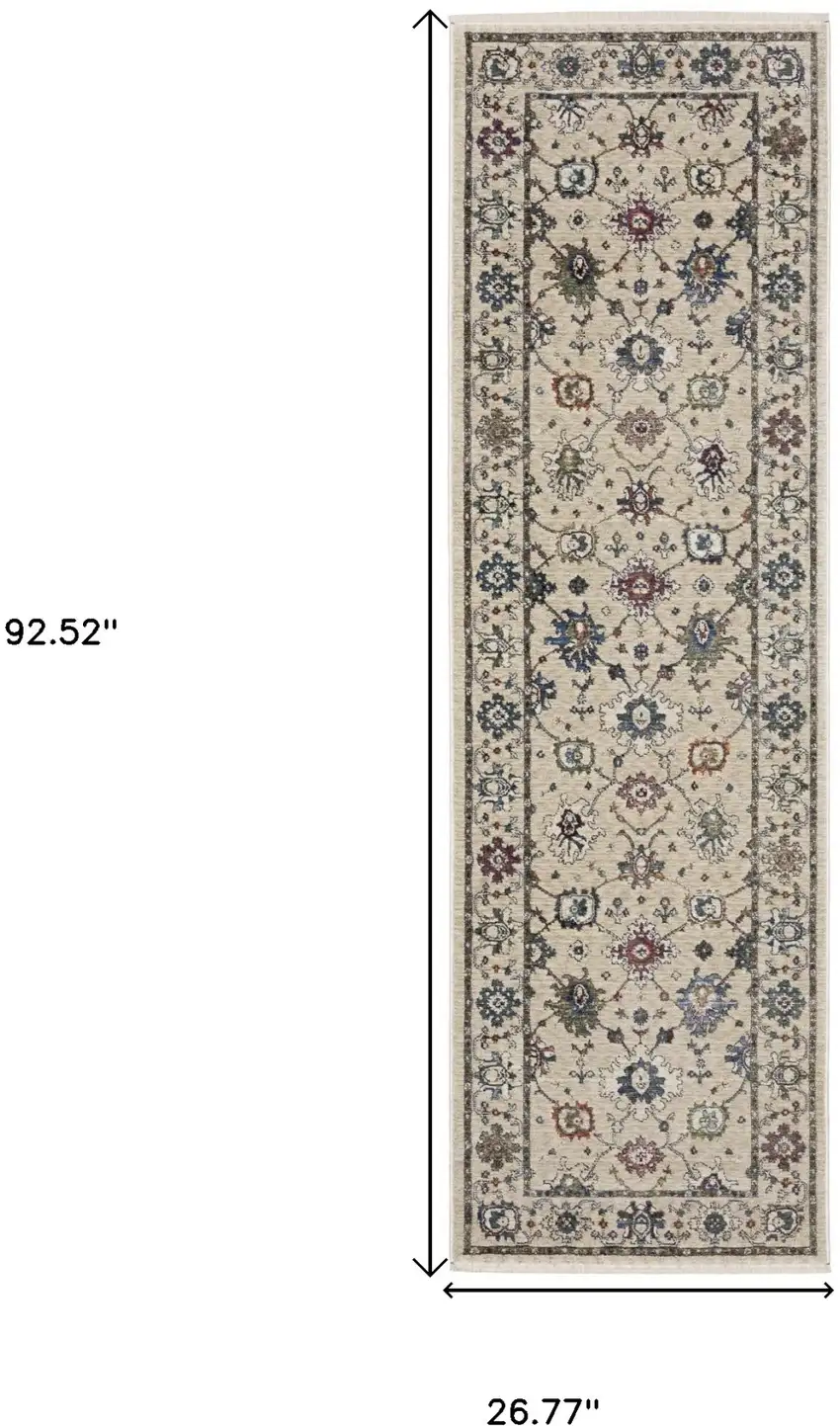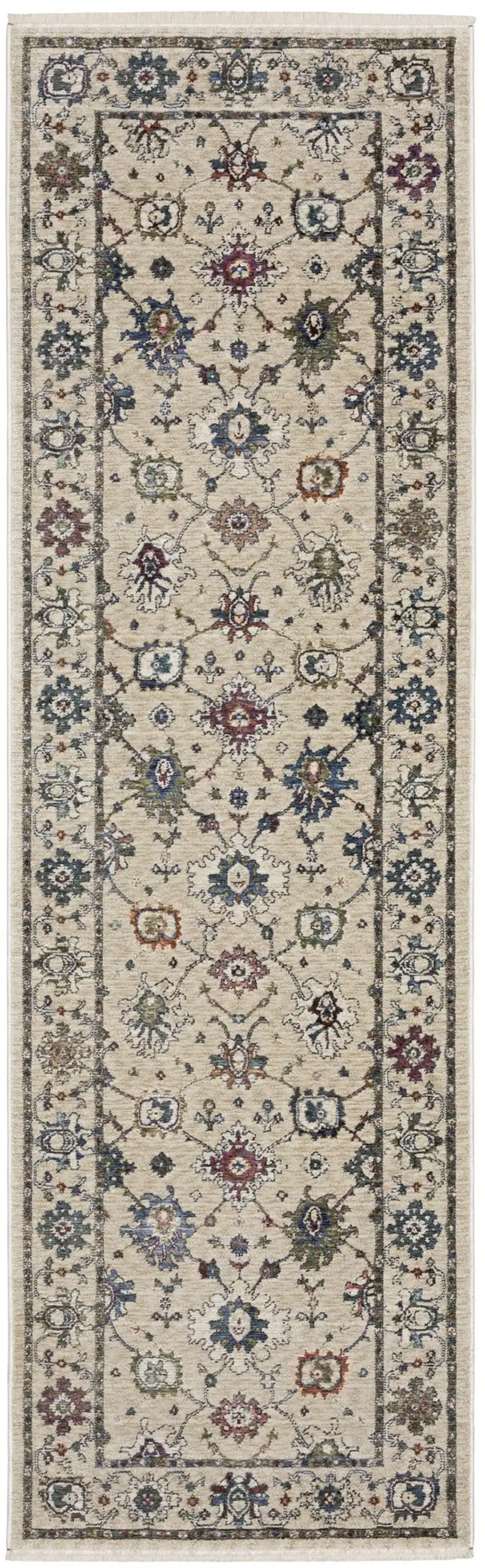 8' Ivory Tan And Blue Floral Runner Rug With Fringe