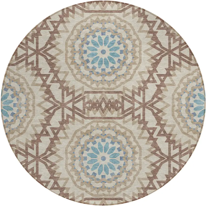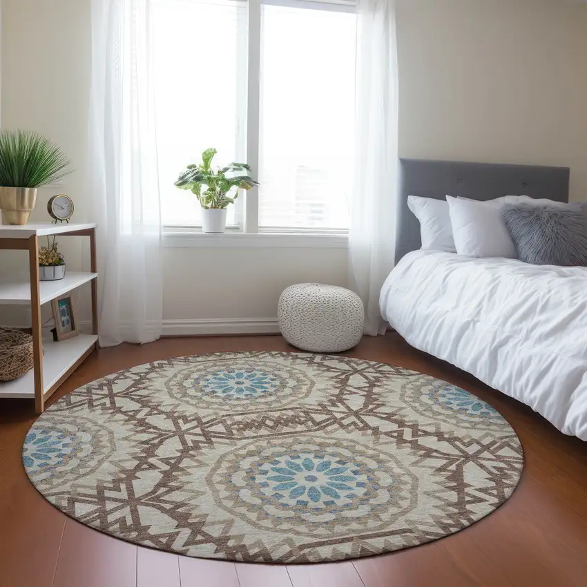 8' Khaki Brown And Taupe Round Floral Medallion Washable Indoor Outdoor Area Rug