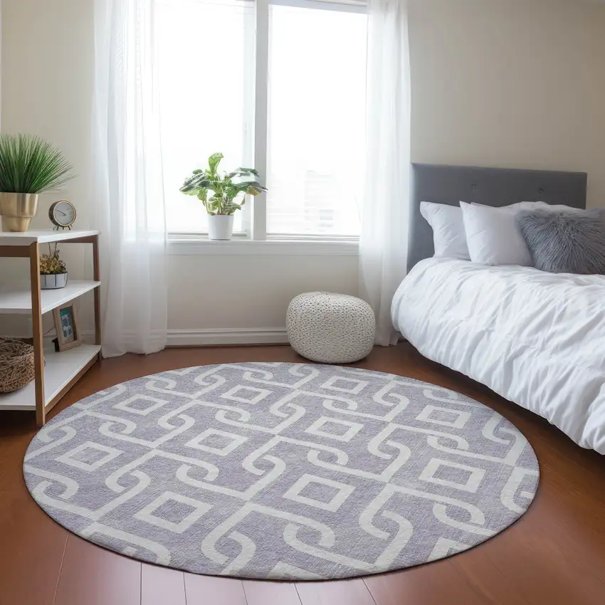 8' Lavender And Ivory Round Geometric Washable Indoor Outdoor Area Rug