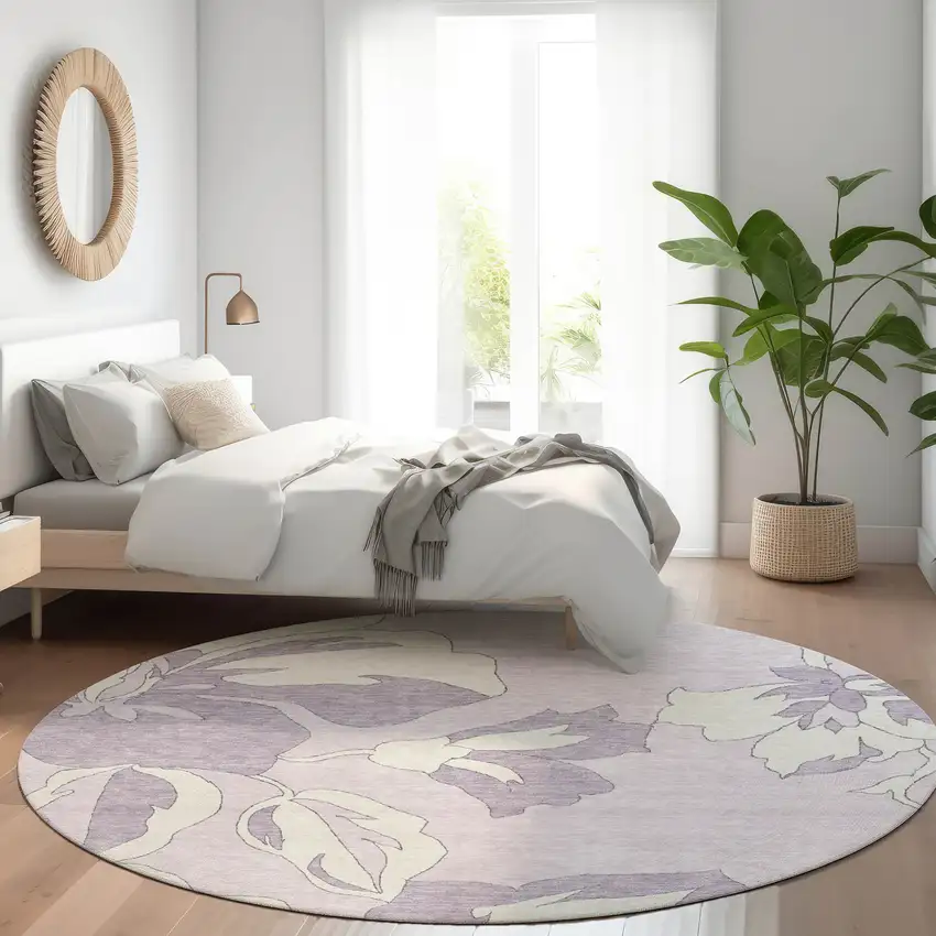 Add great coloration and comfortable texture to your space with this 8-foot lavender lilac and ivory round floral washable indoor outdoor area rug. This geometric round shaped rug features a floral pattern in lavender, lilac, and ivory that combines a good looking print with a unique and updated shape. The mix of shape, color, and design gives this rug refreshing visual interest. Ideal for outdoor spaces or high traffic areas with kids and pets, this rug is made from heavy duty polyester that is stain resistant to help repel water, dirt, and stains. Makes a great way to dress up your patio, porch, or poolside, but also works well as a durable and easy to maintain option in the kitchen, family room, or mudroom. 96-inch h x 96-inch w x 0.19-inch d.