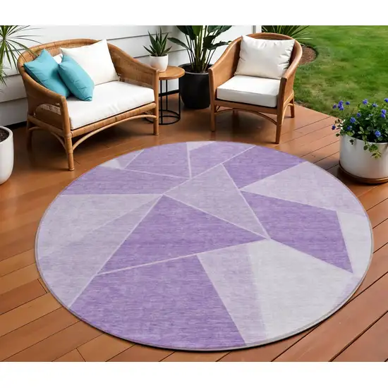 Set an inviting tone in your space with this 8-foot lilac and purple round geometric washable indoor outdoor area rug. This geometric round shaped rug features a geometric pattern in lilac and purple that combines a good looking print with a unique and updated shape. The mix of shape, color, and design gives this rug refreshing visual interest. Ideal for outdoor spaces or high traffic areas with kids and pets, this rug is made from heavy duty polyester that is stain resistant to help repel water, dirt, and stains. Versatile in use, durable, and easy to maintain, this rug is an ideal solution to add a decorative and inviting touch to your indoor or outdoor space. 96-inch h x 96-inch w x 0.19-inch d.