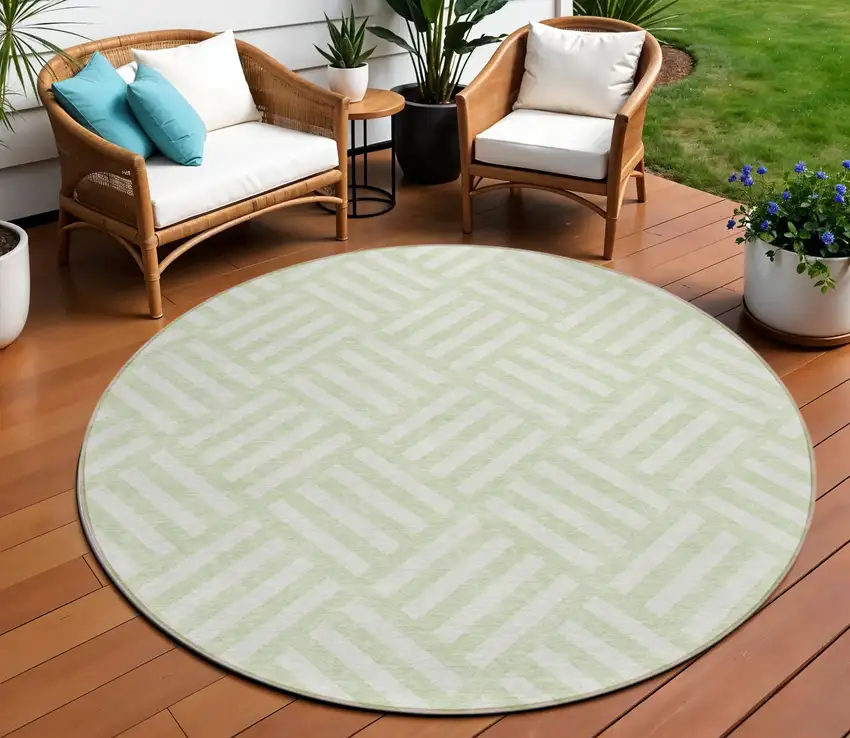 8' Mint Green And Ivory Round Geometric Washable Indoor Outdoor Area Rug