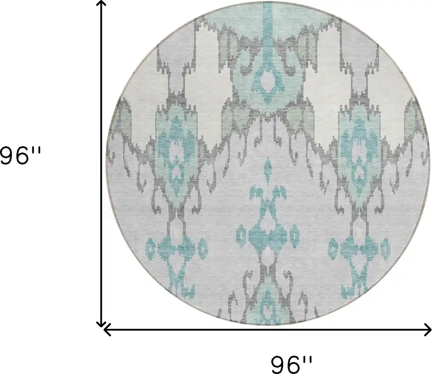 Add some artistry to your room with this 8-foot mint green teal blue and ivory round ikat washable indoor outdoor area rug. This geometric round shaped rug features a ikat pattern in mint green, teal blue, and ivory that combines a good looking print with a unique and updated shape. The mix of shape, color, and design gives this rug refreshing visual interest. Ideal for outdoor spaces or high traffic areas with kids and pets, this rug is made from heavy duty polyester that is stain resistant to help repel water, dirt, and stains. Versatile in use, durable, and easy to maintain, this rug is an ideal solution to add a decorative and inviting touch to your indoor or outdoor space. 96-inch h x 96-inch w x 0.19-inch d.