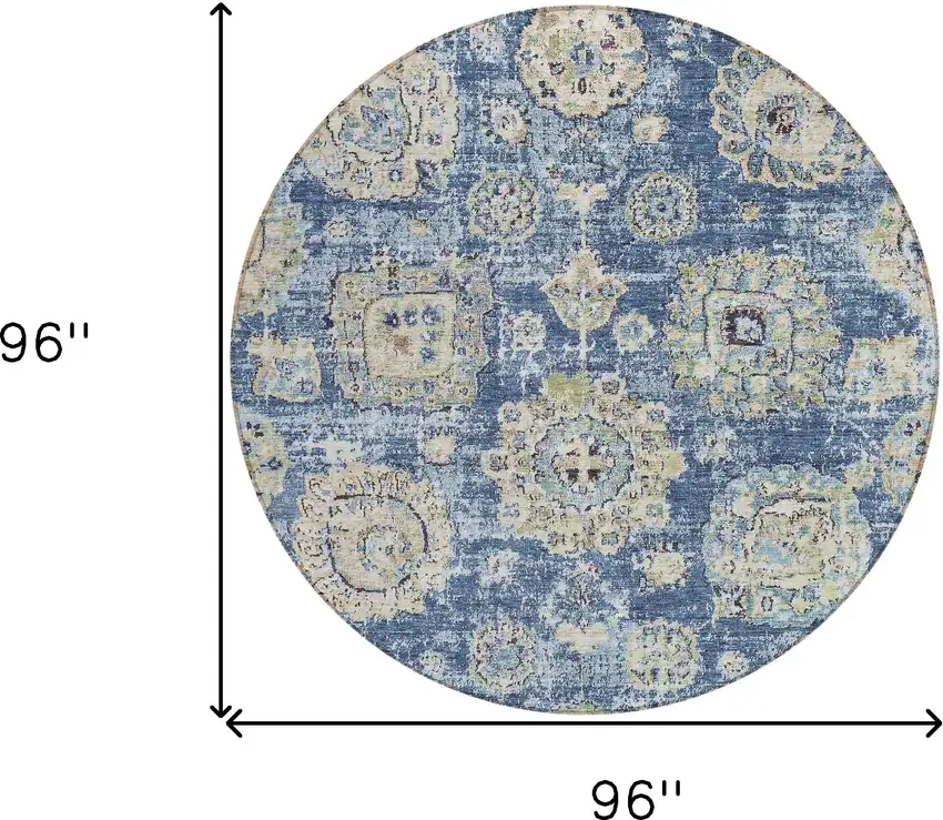 8' Navy Blue And Beige Round Floral Washable Indoor Outdoor Area Rug