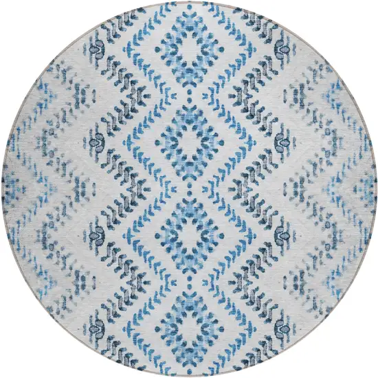 Set an inviting tone in your space with this 8-foot navy blue and denim blue round geometric washable indoor outdoor area rug. This geometric round shaped rug features a geometric pattern in navy blue and denim blue that combines a good looking print with a unique and updated shape. The mix of shape, color, and design gives this rug refreshing visual interest. Ideal for outdoor spaces or high traffic areas with kids and pets, this rug is made from heavy duty polyester that is stain resistant to help repel water, dirt, and stains. Versatile in use, durable, and easy to maintain, this rug is an ideal solution to add a decorative and inviting touch to your indoor or outdoor space. 96-inch h x 96-inch w x 0.19-inch d.