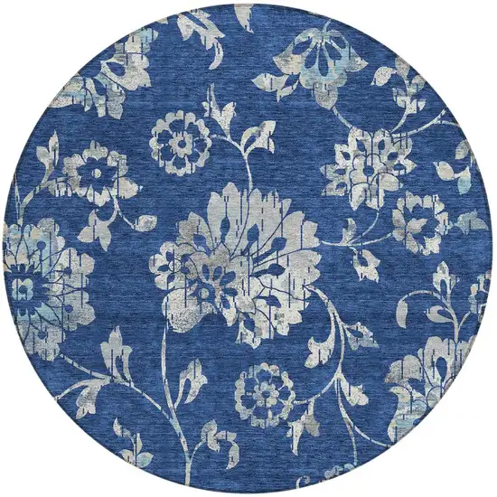 8' Navy Blue And Gray Round Floral Washable Indoor Outdoor Area Rug