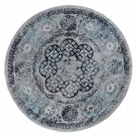 Add great coloration and comfortable texture to your space with this 8-foot navy blue and ivory damask distressed round rug. Ideal for spaces with kids and pets, this rug is stain resistant to help repel dirt and spilled liquids. Built to last, this rug crafted from polypropylene fibers is known for its durability and long lasting appeal. Rugs are a great way to showcase your style, hide imperfections, warm your home and reduce noise. This geometric round shaped rug features a damask pattern in navy blue and ivory that combines a good looking print with a unique and updated shape. The mix of shape, color, and design gives this rug refreshing visual interest. This larger sized, cottage styled rug is ready to create a focal point or statement piece in your room. 96-inch h x 96-inch w x 0.39-inch d.