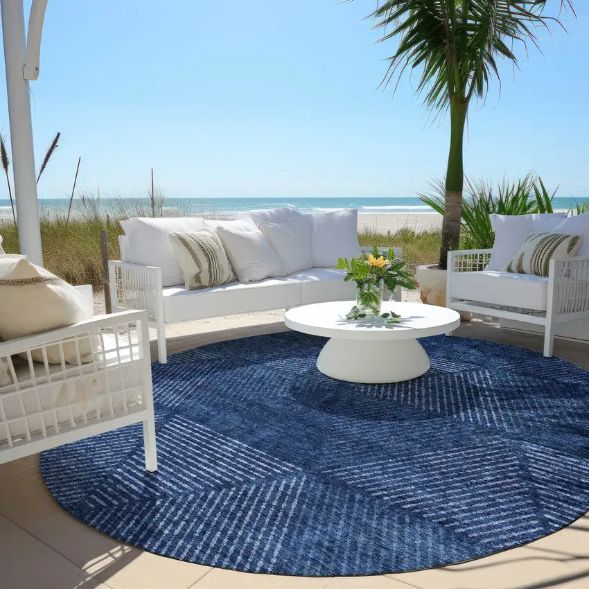 Add some artistry to your room with this 8-foot navy blue and sky blue round geometric washable indoor outdoor area rug. This geometric round shaped rug features a geometric pattern in navy blue and sky blue that combines a good looking print with a unique and updated shape. The mix of shape, color, and design gives this rug refreshing visual interest. Ideal for outdoor spaces or high traffic areas with kids and pets, this rug is made from heavy duty polyester that is stain resistant to help repel water, dirt, and stains. Makes a great way to dress up your patio, porch, or poolside, but also works well as a durable and easy to maintain option in the kitchen, family room, or mudroom. 96-inch h x 96-inch w x 0.19-inch d.
