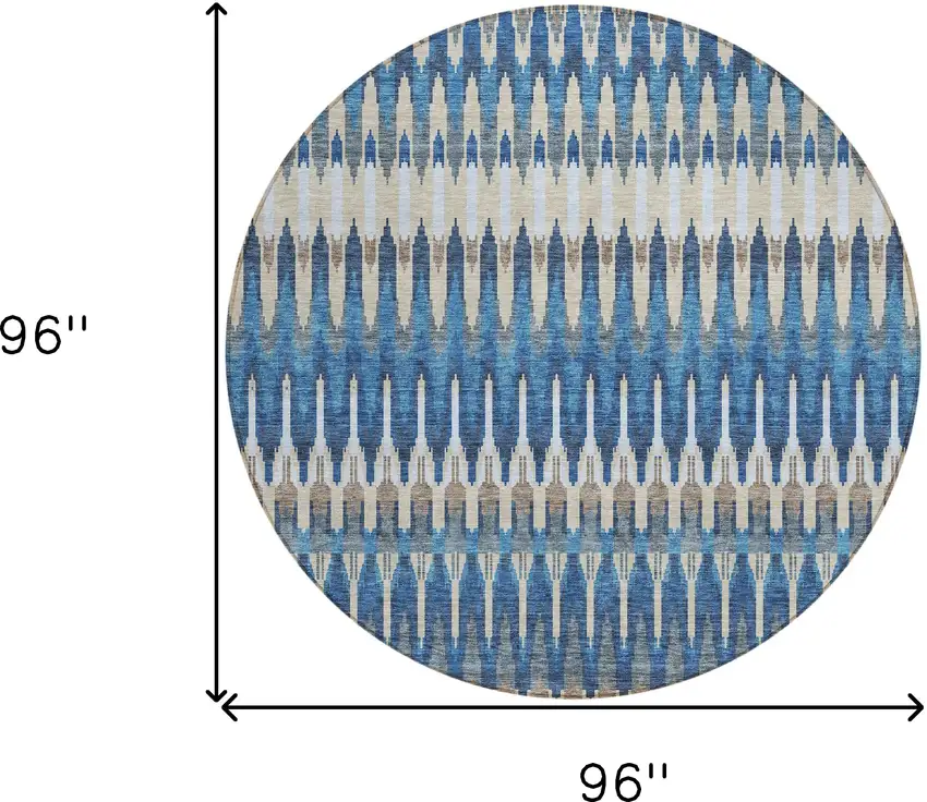 This 8-foot navy blue denim blue and ivory round southwestern washable indoor outdoor area rug, is a great way to add warmth to a room. This geometric round shaped rug features a southwestern pattern in navy blue, denim blue, and ivory that combines a good looking print with a unique and updated shape. The mix of shape, color, and design gives this rug refreshing visual interest. Ideal for outdoor spaces or high traffic areas with kids and pets, this rug is made from heavy duty polyester that is stain resistant to help repel water, dirt, and stains. Makes a great way to dress up your patio, porch, or poolside, but also works well as a durable and easy to maintain option in the kitchen, family room, or mudroom. 96-inch h x 96-inch w x 0.19-inch d.