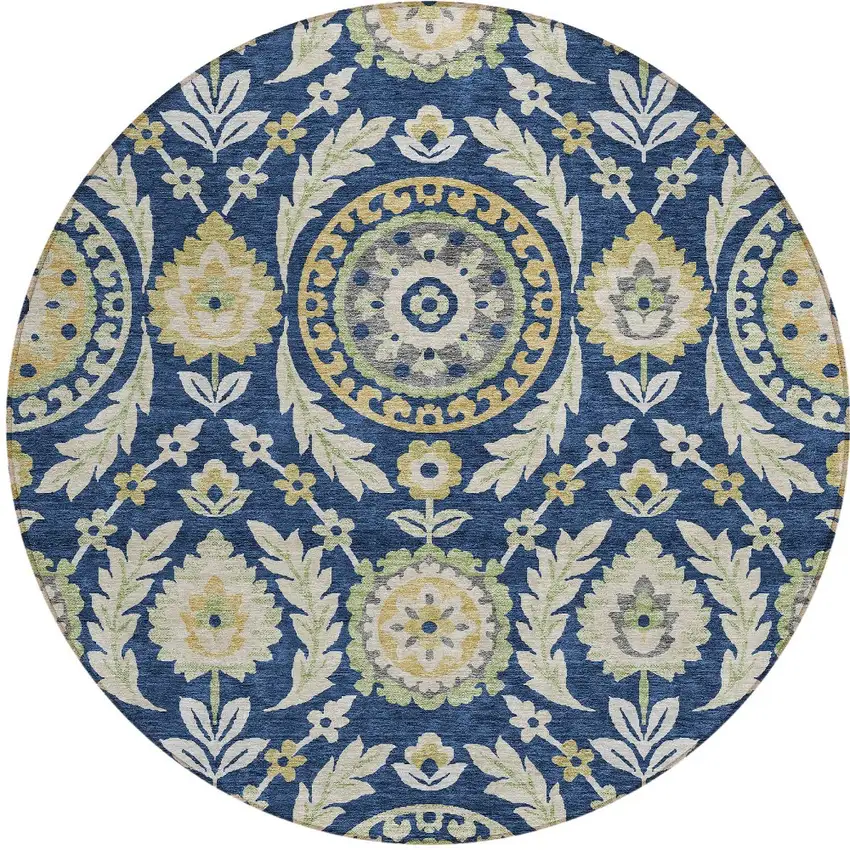 This 8-foot navy blue gold and beige round floral washable indoor outdoor area rug, is a great way to add warmth to a room. This geometric round shaped rug features a floral pattern in navy blue, gold, and beige that combines a good looking print with a unique and updated shape. The mix of shape, color, and design gives this rug refreshing visual interest. Ideal for outdoor spaces or high traffic areas with kids and pets, this rug is made from heavy duty polyester that is stain resistant to help repel water, dirt, and stains. Makes a great way to dress up your patio, porch, or poolside, but also works well as a durable and easy to maintain option in the kitchen, family room, or mudroom. 96-inch h x 96-inch w x 0.19-inch d.