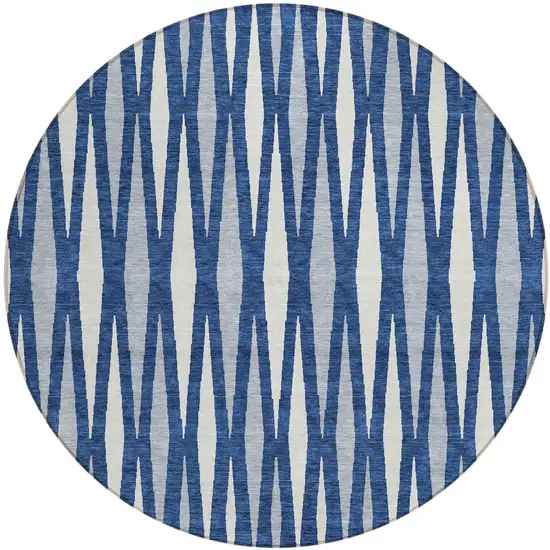 This 8-foot navy blue gray and ivory round geometric washable indoor outdoor area rug, is a great way to add warmth to a room. This geometric round shaped rug features a geometric pattern in navy blue, gray, and ivory that combines a good looking print with a unique and updated shape. The mix of shape, color, and design gives this rug refreshing visual interest. Ideal for outdoor spaces or high traffic areas with kids and pets, this rug is made from heavy duty polyester that is stain resistant to help repel water, dirt, and stains. Versatile in use, durable, and easy to maintain, this rug is an ideal solution to add a decorative and inviting touch to your indoor or outdoor space. 96-inch h x 96-inch w x 0.19-inch d.
