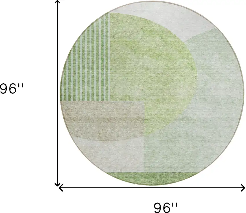 This 8-foot olive green and artichoke green round geometric washable indoor outdoor area rug, is a great way to add warmth to a room. This geometric round shaped rug features a geometric pattern in olive green and artichoke green that combines a good looking print with a unique and updated shape. The mix of shape, color, and design gives this rug refreshing visual interest. Ideal for outdoor spaces or high traffic areas with kids and pets, this rug is made from heavy duty polyester that is stain resistant to help repel water, dirt, and stains. Versatile in use, durable, and easy to maintain, this rug is an ideal solution to add a decorative and inviting touch to your indoor or outdoor space. 96-inch h x 96-inch w x 0.19-inch d.