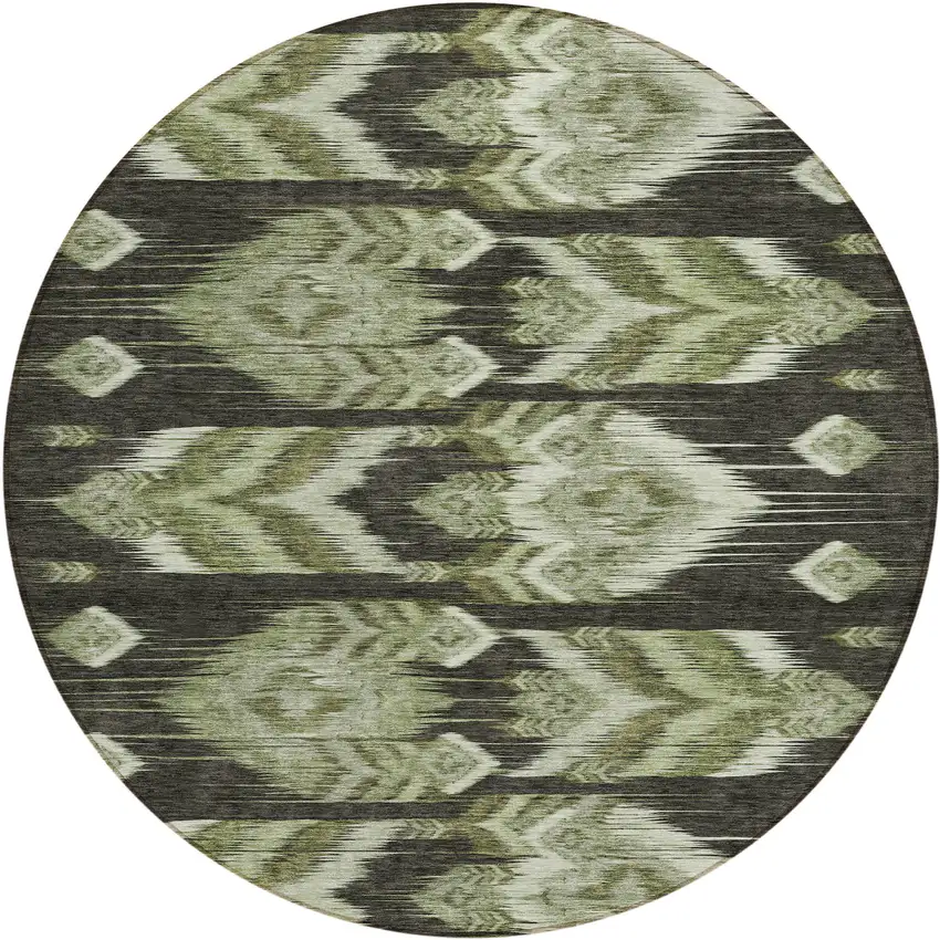 Set an inviting tone in your space with this 8-foot olive green and artichoke green round southwestern washable indoor outdoor area rug. This geometric round shaped rug features a southwestern pattern in olive green and artichoke green that combines a good looking print with a unique and updated shape. The mix of shape, color, and design gives this rug refreshing visual interest. Ideal for outdoor spaces or high traffic areas with kids and pets, this rug is made from heavy duty polyester that is stain resistant to help repel water, dirt, and stains. Versatile in use, durable, and easy to maintain, this rug is an ideal solution to add a decorative and inviting touch to your indoor or outdoor space. 96-inch h x 96-inch w x 0.19-inch d.