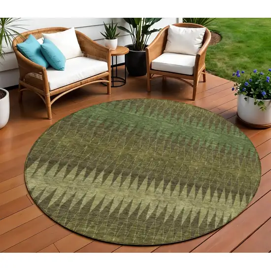Add some artistry to your room with this 8-foot olive green and dark green round striped washable indoor outdoor area rug. This geometric round shaped rug features a striped pattern in olive green and dark green that combines a good looking print with a unique and updated shape. The mix of shape, color, and design gives this rug refreshing visual interest. Ideal for outdoor spaces or high traffic areas with kids and pets, this rug is made from heavy duty polyester that is stain resistant to help repel water, dirt, and stains. Versatile in use, durable, and easy to maintain, this rug is an ideal solution to add a decorative and inviting touch to your indoor or outdoor space. 96-inch h x 96-inch w x 0.19-inch d.