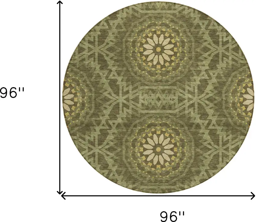 8' Olive Green Artichoke Green And Gold Round Floral Medallion Washable Indoor Outdoor Area Rug