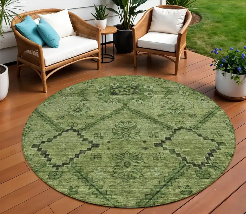 Set an inviting tone in your space with this 8-foot olive green fern green and artichoke green round floral washable indoor outdoor area rug. This geometric round shaped rug features a floral pattern in olive green, fern green, and artichoke green that combines a good looking print with a unique and updated shape. The mix of shape, color, and design gives this rug refreshing visual interest. Ideal for outdoor spaces or high traffic areas with kids and pets, this rug is made from heavy duty polyester that is stain resistant to help repel water, dirt, and stains. Makes a great way to dress up your patio, porch, or poolside, but also works well as a durable and easy to maintain option in the kitchen, family room, or mudroom. 96-inch h x 96-inch w x 0.19-inch d.