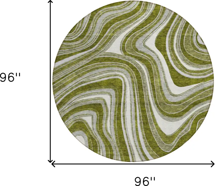 Add great coloration and comfortable texture to your space with this 8-foot olive green gray and ivory round abstract washable indoor outdoor area rug. This geometric round shaped rug features a abstract pattern in olive green, gray, and ivory that combines a good looking print with a unique and updated shape. The mix of shape, color, and design gives this rug refreshing visual interest. Ideal for outdoor spaces or high traffic areas with kids and pets, this rug is made from heavy duty polyester that is stain resistant to help repel water, dirt, and stains. Makes a great way to dress up your patio, porch, or poolside, but also works well as a durable and easy to maintain option in the kitchen, family room, or mudroom. 96-inch h x 96-inch w x 0.19-inch d.