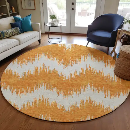 8' Orange And Ivory Round Chevron Washable Indoor Outdoor Area Rug