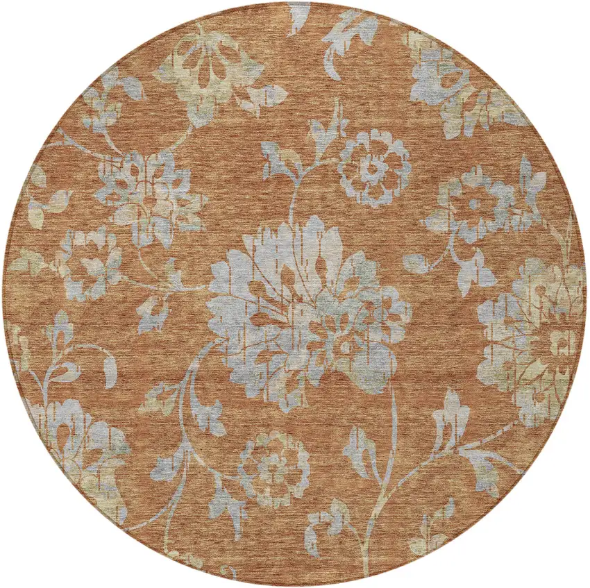 8' Orange Copper And Gray Round Floral Washable Indoor Outdoor Area Rug