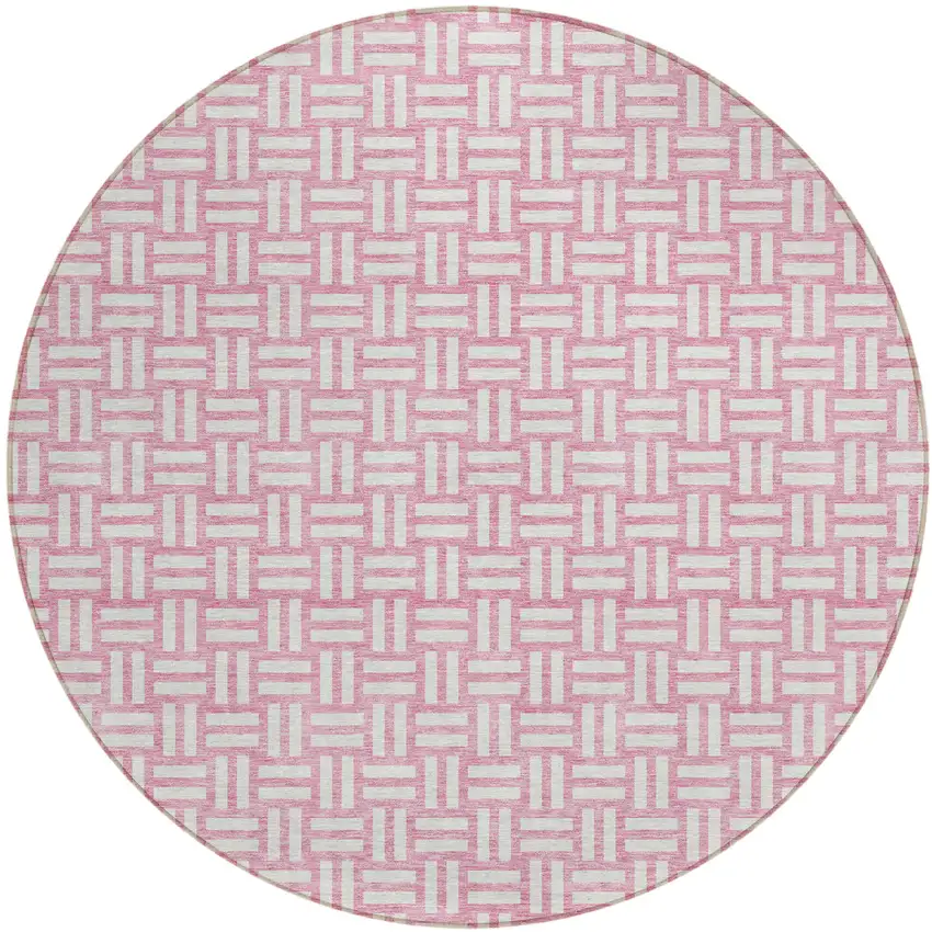 8' Pink And Ivory Round Geometric Washable Indoor Outdoor Area Rug