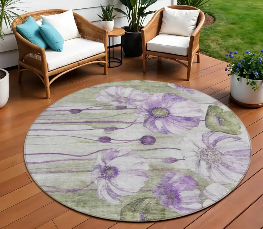 8' Purple And Lavender Round Floral Washable Indoor Outdoor Area Rug