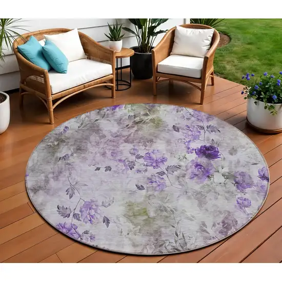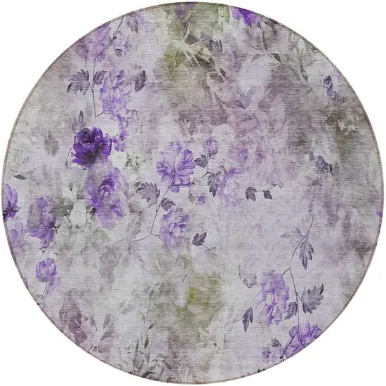 This 8-foot purple lavender and artichoke green round floral washable indoor outdoor area rug, is a great way to add warmth to a room. This geometric round shaped rug features a floral pattern in purple, lavender, and artichoke green that combines a good looking print with a unique and updated shape. The mix of shape, color, and design gives this rug refreshing visual interest. Ideal for outdoor spaces or high traffic areas with kids and pets, this rug is made from heavy duty polyester that is stain resistant to help repel water, dirt, and stains. Versatile in use, durable, and easy to maintain, this rug is an ideal solution to add a decorative and inviting touch to your indoor or outdoor space. 96-inch h x 96-inch w x 0.19-inch d.