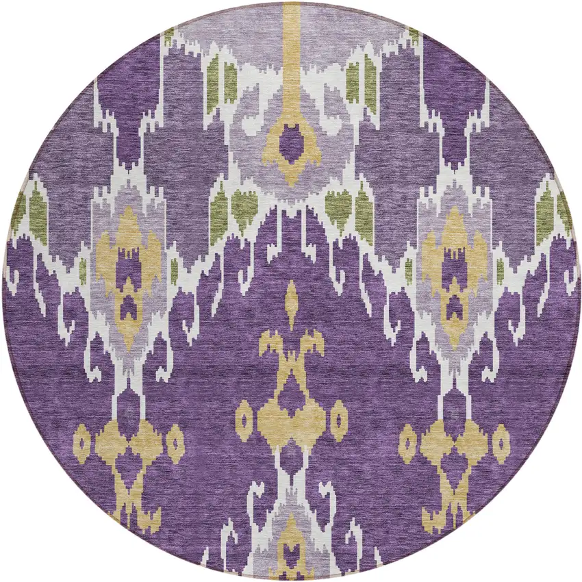 8' Purple Lavender And Gold Round Ikat Washable Indoor Outdoor Area Rug