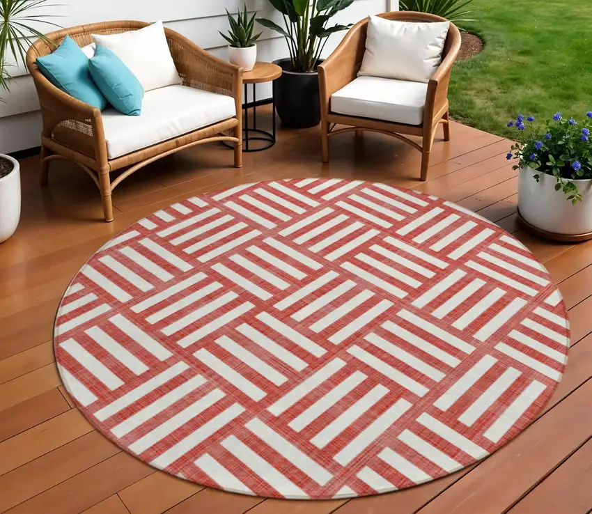 8' Red And Ivory Round Geometric Washable Indoor Outdoor Area Rug