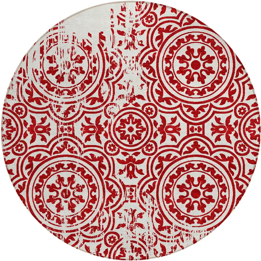 8' Red And Ivory Round Medallion Washable Indoor Outdoor Area Rug