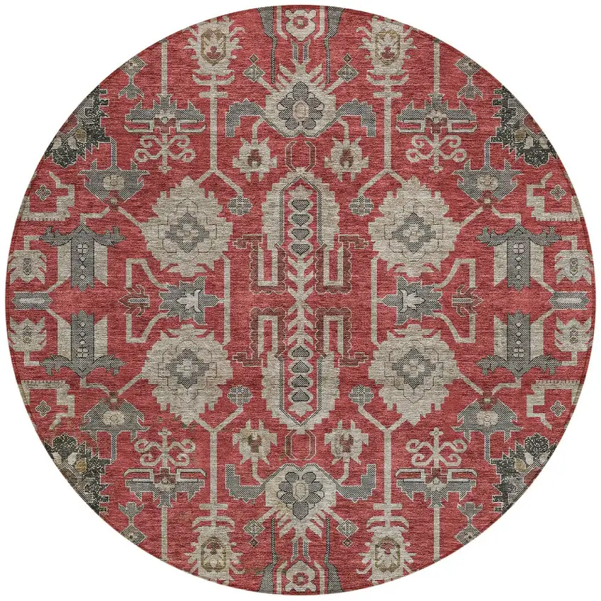 8' Red Beige And Charcoal Round Oriental Washable Indoor Outdoor Area Rug