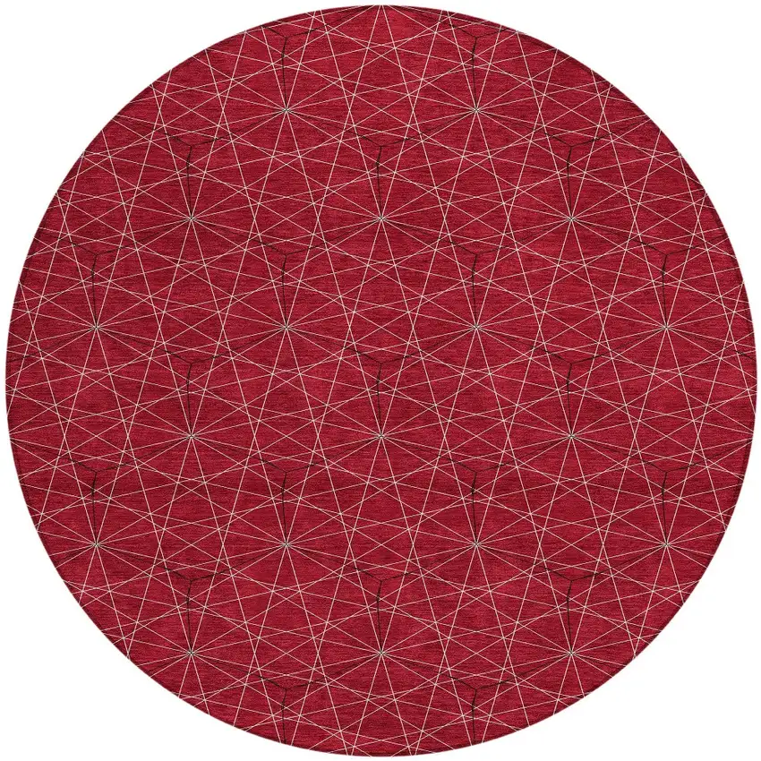Add great coloration and comfortable texture to your space with this 8-foot red black and ivory round geometric washable indoor outdoor area rug. This geometric round shaped rug features a geometric pattern in red, black, and ivory that combines a good looking print with a unique and updated shape. The mix of shape, color, and design gives this rug refreshing visual interest. Ideal for outdoor spaces or high traffic areas with kids and pets, this rug is made from heavy duty polyester that is stain resistant to help repel water, dirt, and stains. Makes a great way to dress up your patio, porch, or poolside, but also works well as a durable and easy to maintain option in the kitchen, family room, or mudroom. 96-inch h x 96-inch w x 0.19-inch d.