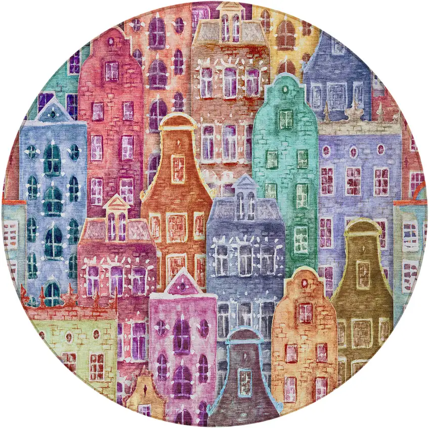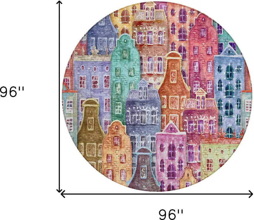 Add some artistry to your room with this 8-foot red gold and teal blue round village houses washable indoor outdoor area rug. This geometric round shaped rug features a village houses pattern in red, gold, and teal blue that combines a good looking print with a unique and updated shape. The mix of shape, color, and design gives this rug refreshing visual interest. Ideal for outdoor spaces or high traffic areas with kids and pets, this rug is made from heavy duty polyester that is stain resistant to help repel water, dirt, and stains. Versatile in use, durable, and easy to maintain, this rug is an ideal solution to add a decorative and inviting touch to your indoor or outdoor space. 96-inch h x 96-inch w x 0.19-inch d.
