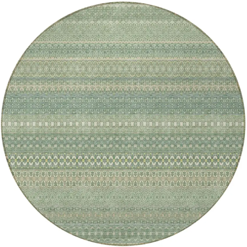 Set an inviting tone in your space with this 8-foot round artichoke green round striped washable stain resistant non skid indoor outdoor area rug. This geometric round shaped rug features a striped pattern in artichoke green that combines a good looking print with a unique and updated shape. The mix of shape, color, and design gives this rug refreshing visual interest. Ideal for spaces with kids and pets, this rug is stain resistant to help repel stains and spilled liquids. Area rugs help to give warmth and sense of home to your space. 96-inch H x 96-inch W x 0.19-inch D