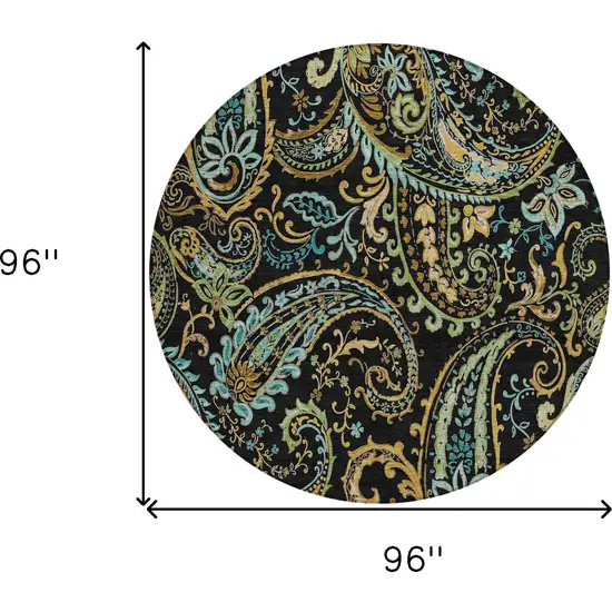 Add some artistry to your room with this 8-foot round black and gold round paisley washable stain resistant non skid indoor outdoor area rug. This geometric round shaped rug features a paisley pattern in black and gold that combines a good looking print with a unique and updated shape. The mix of shape, color, and design gives this rug refreshing visual interest. Ideal for spaces with kids and pets, this rug is stain resistant to help repel stains and spilled liquids. Place this area rug against a hardwood or tile floor and it will enliven your living space with style and sophistication. 96-inch H x 96-inch W x 0.19-inch D
