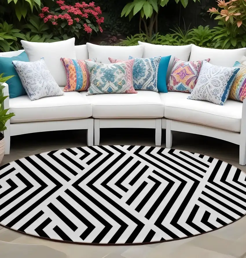 Set an inviting tone in your space with this 8-foot round black and white round geometric washable stain resistant non skid indoor outdoor area rug. This geometric round shaped rug features a geometric pattern in black and white that combines a good looking print with a unique and updated shape. The mix of shape, color, and design gives this rug refreshing visual interest. The coloration of this rug infuses an updated and modern vibe into your space. Ideal for spaces with kids and pets, this rug is stain resistant to help repel stains and spilled liquids. Place this area rug against a hardwood or tile floor and it will enliven your living space with style and sophistication. 96-inch H x 96-inch W x 0.19-inch D