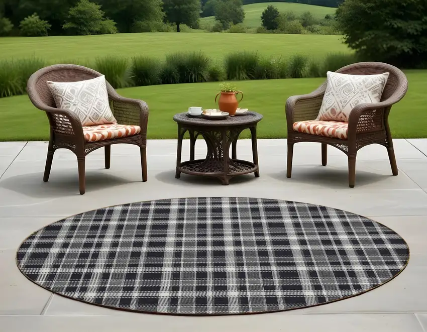Add some artistry to your room with this 8-foot round black gray and white round plaid washable stain resistant non skid indoor outdoor area rug. This geometric round shaped rug features a plaid pattern in black gray and white that combines a good looking print with a unique and updated shape. The mix of shape, color, and design gives this rug refreshing visual interest. Ideal for spaces with kids and pets, this rug is stain resistant to help repel stains and spilled liquids. Area rugs help to give warmth and sense of home to your space. 96-inch H x 96-inch W x 0.19-inch D