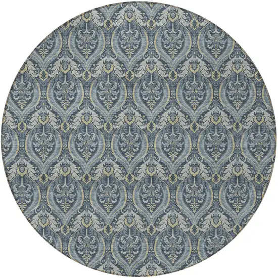8' Round Blue and Cream Round Damask Washable Non Skid Indoor Outdoor Area Rug