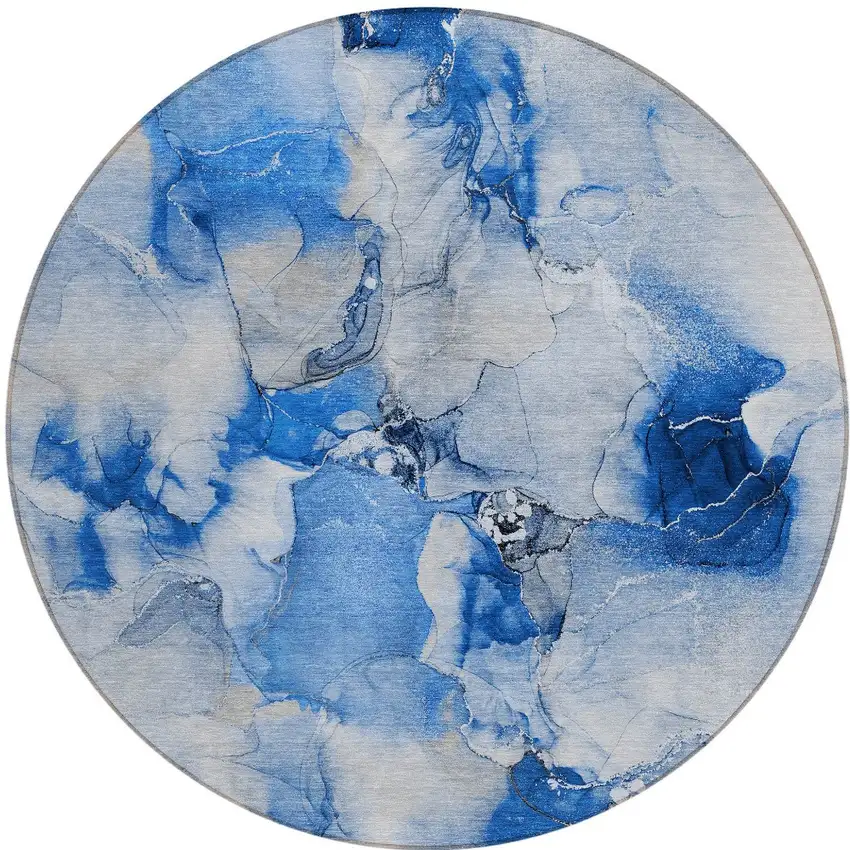 Add some artistry to your room with this 8-foot round blue and ivory round abstract washable stain resistant non skid indoor outdoor area rug. This geometric round shaped rug features a abstract pattern in blue and ivory that combines a good looking print with a unique and updated shape. The mix of shape, color, and design gives this rug refreshing visual interest. Ideal for spaces with kids and pets, this rug is stain resistant to help repel stains and spilled liquids. Area rugs help to give warmth and sense of home to your space. 96-inch H x 96-inch W x 0.19-inch D