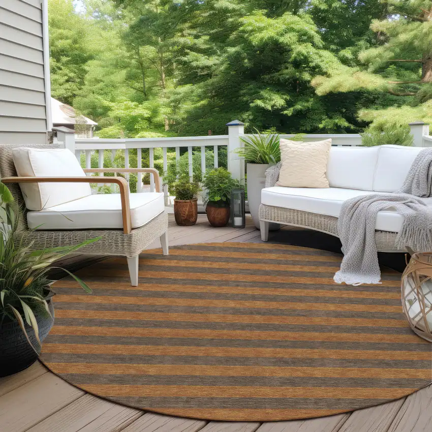 8' Round Brown and Tan Round Striped Washable Non Skid Indoor Outdoor Area Rug