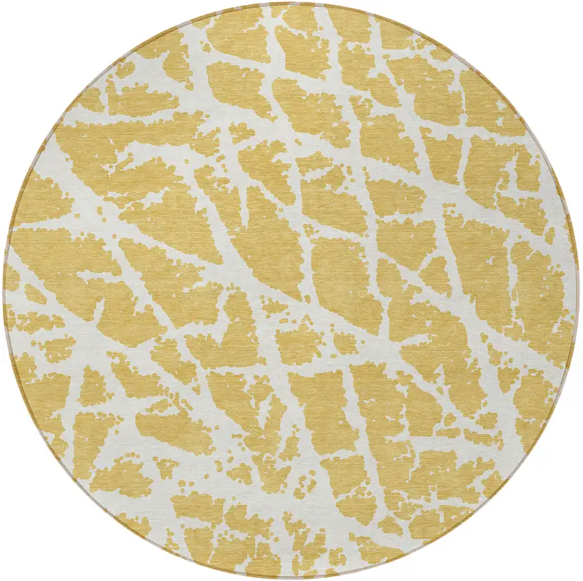 Add great coloration and comfortable texture to your space with this 8-foot round gold and white round abstract washable stain resistant non skid indoor outdoor area rug. This geometric round shaped rug features a abstract pattern in gold and white that combines a good looking print with a unique and updated shape. The mix of shape, color, and design gives this rug refreshing visual interest. Ideal for spaces with kids and pets, this rug is stain resistant to help repel stains and spilled liquids. Area rugs help to give warmth and sense of home to your space. 96-inch H x 96-inch W x 0.19-inch D