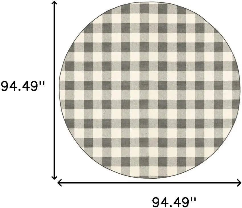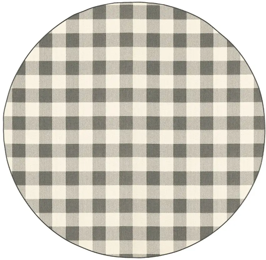 Introduce a cozy accent to your indoor or outdoor living areas with this round rug. It boasts a charming gray and ivory gingham pattern, articulating a blend of a casual yet sophisticated style.