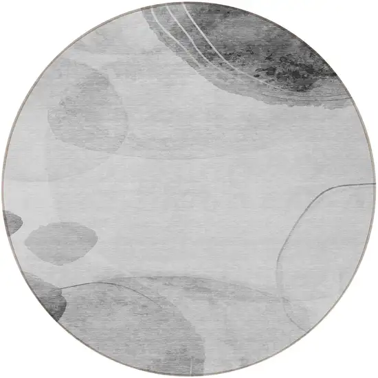 Add some artistry to your room with this 8-foot round gray and light gray round abstract washable stain resistant non skid indoor outdoor area rug. This geometric round shaped rug features a abstract pattern in gray and light gray that combines a good looking print with a unique and updated shape. The mix of shape, color, and design gives this rug refreshing visual interest. Ideal for spaces with kids and pets, this rug is stain resistant to help repel stains and spilled liquids. Area rugs help to give warmth and sense of home to your space. 96-inch H x 96-inch W x 0.19-inch D
