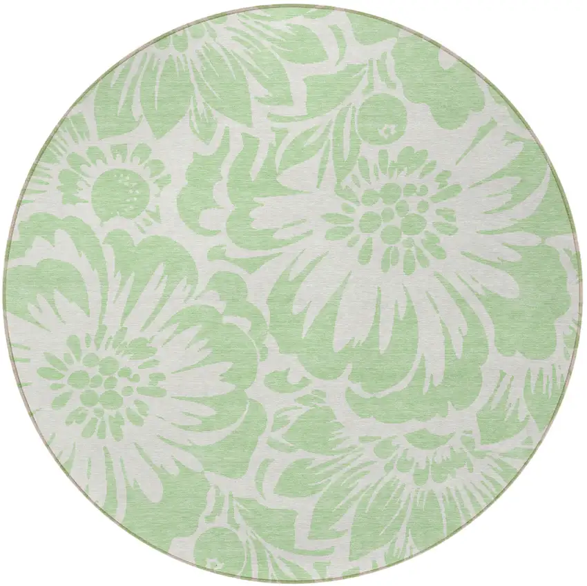 Add some artistry to your room with this 8-foot round mint green and ivory round floral washable stain resistant non skid indoor outdoor area rug. This geometric round shaped rug features a floral pattern in mint green and ivory that combines a good looking print with a unique and updated shape. The mix of shape, color, and design gives this rug refreshing visual interest. Ideal for spaces with kids and pets, this rug is stain resistant to help repel stains and spilled liquids. Place this area rug against a hardwood or tile floor and it will enliven your living space with style and sophistication. 96-inch H x 96-inch W x 0.19-inch D