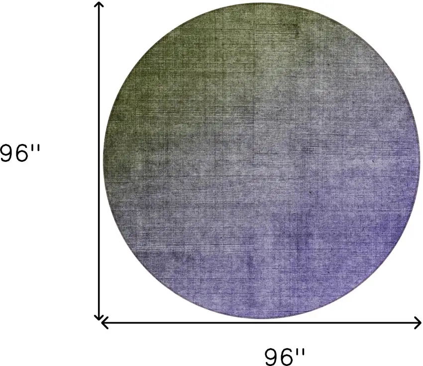 Set an inviting tone in your space with this 8-foot round olive green and purple round ombre washable stain resistant non skid indoor outdoor area rug. This geometric round shaped rug features a ombre pattern in olive green and purple that combines a good looking print with a unique and updated shape. The mix of shape, color, and design gives this rug refreshing visual interest. Ideal for spaces with kids and pets, this rug is stain resistant to help repel stains and spilled liquids. Place this area rug against a hardwood or tile floor and it will enliven your living space with style and sophistication. 96-inch H x 96-inch W x 0.19-inch D