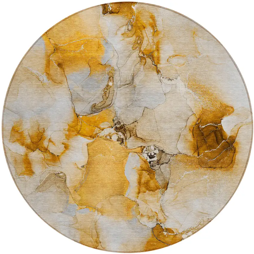 Add great coloration and comfortable texture to your space with this 8-foot round orange and ivory round abstract washable stain resistant non skid indoor outdoor area rug. This geometric round shaped rug features a abstract pattern in orange and ivory that combines a good looking print with a unique and updated shape. The mix of shape, color, and design gives this rug refreshing visual interest. Ideal for spaces with kids and pets, this rug is stain resistant to help repel stains and spilled liquids. Area rugs help to give warmth and sense of home to your space. 96-inch H x 96-inch W x 0.19-inch D